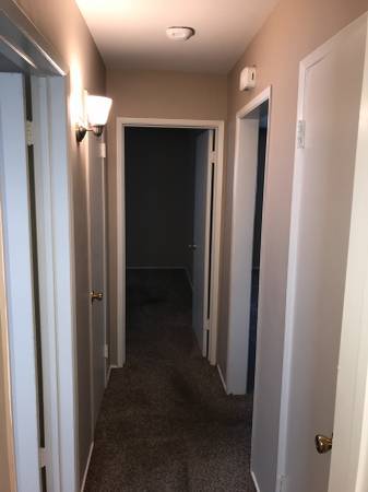 Neutral plush carpeting, with plank flooring at bath, kitchen, hallway and entry.