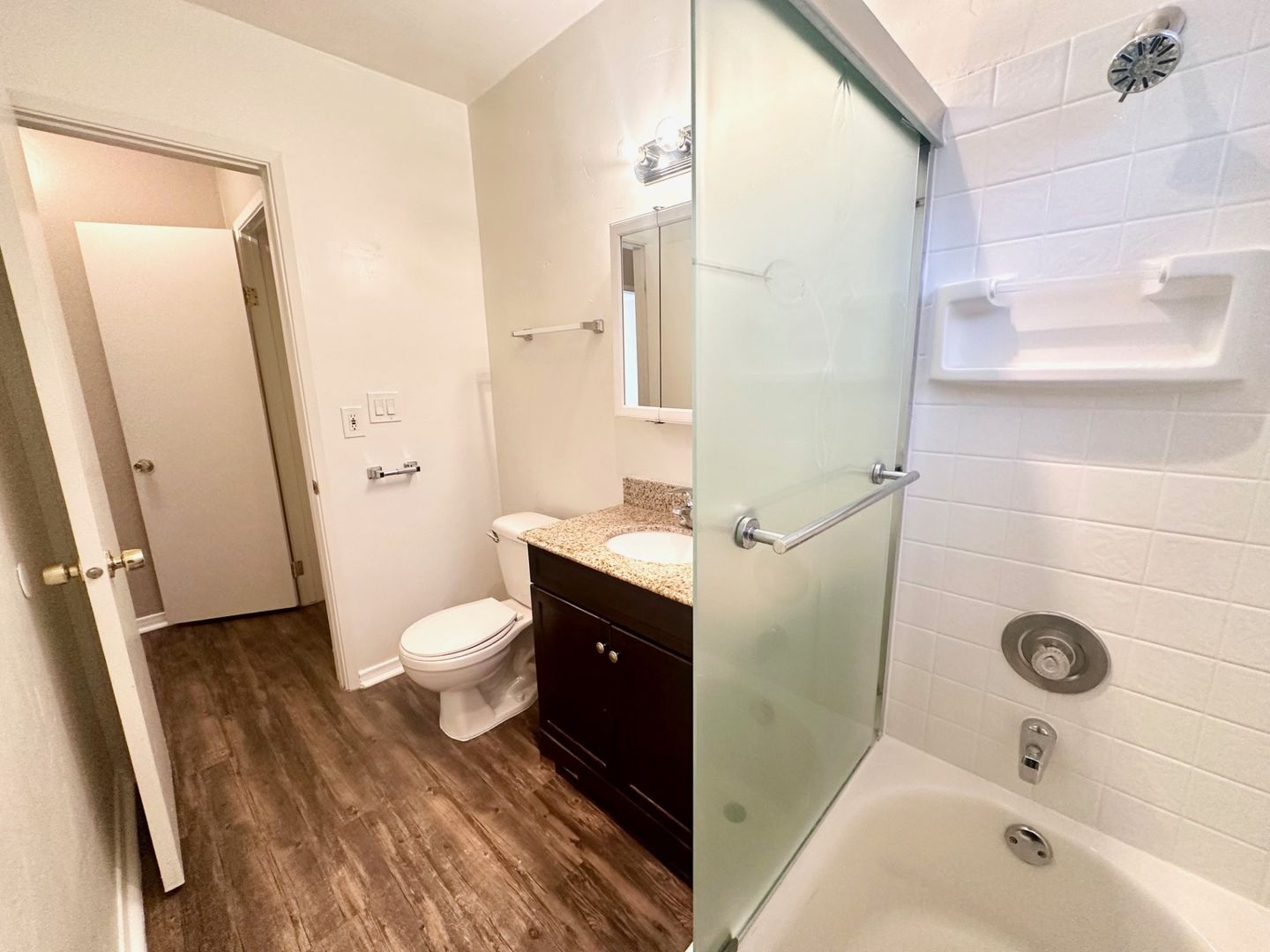 Luxury Plank flooring at living room, dining room, kitchen, hallway, and bath.