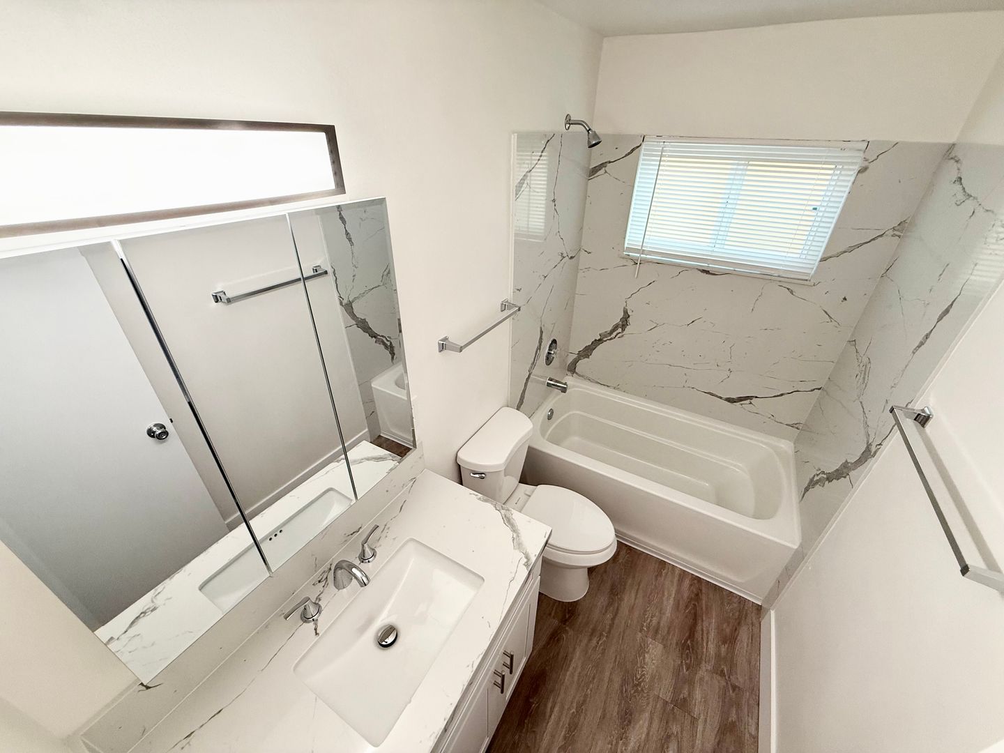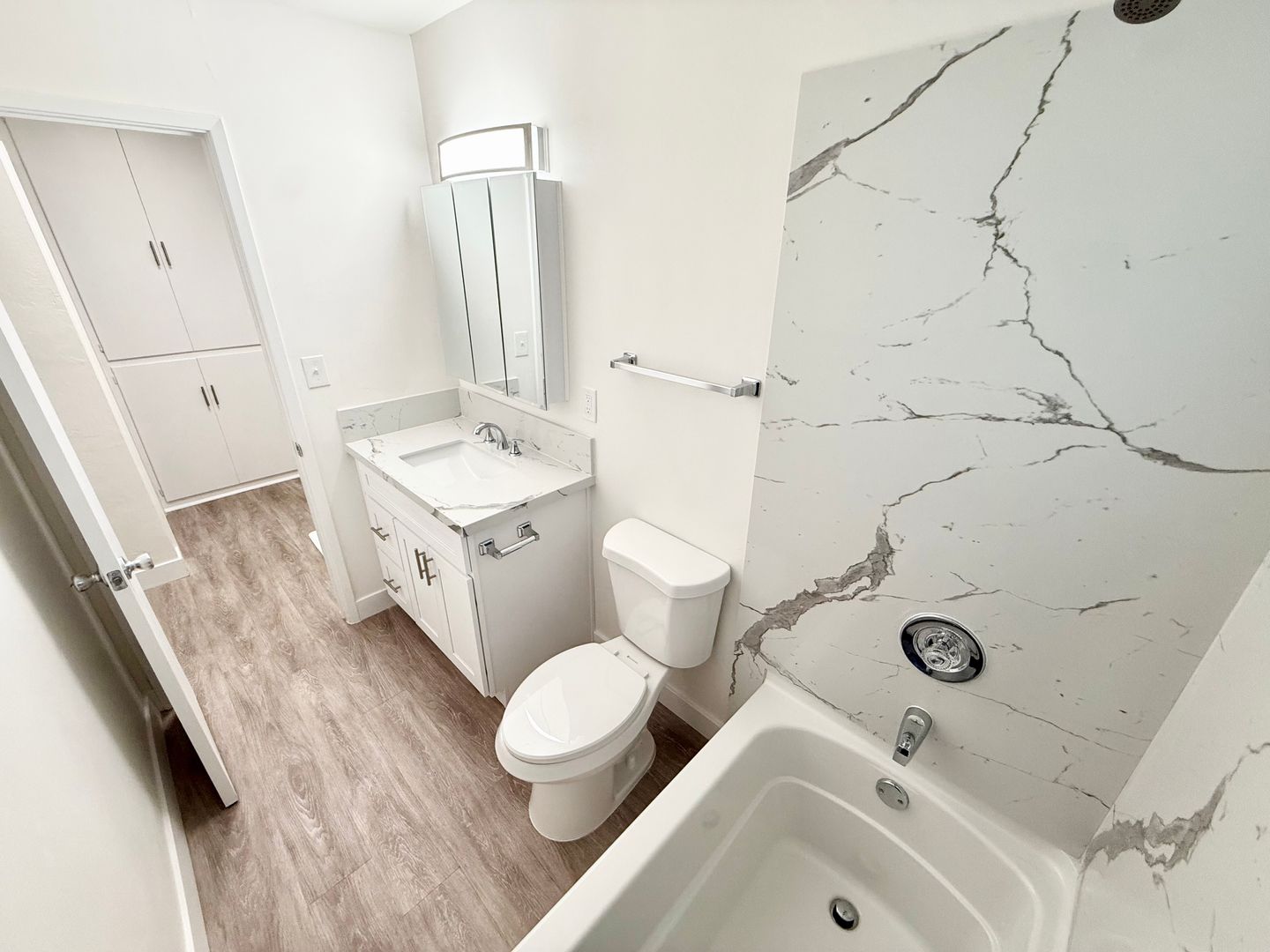 Brand new quartz walls around bathtub!